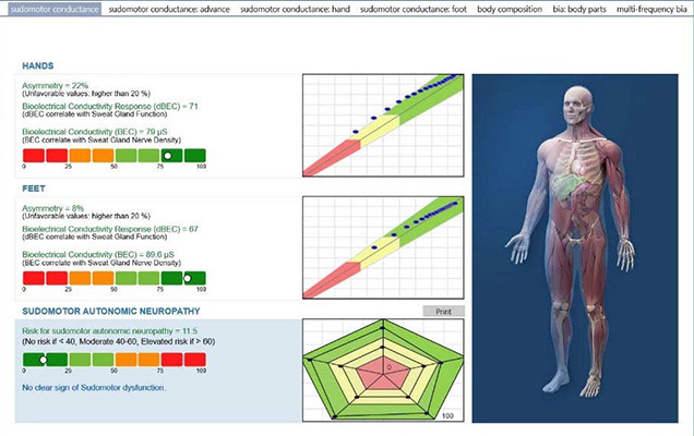 Апаратурата дава възможност за извършване на количествена оценка на потния отговор (симпатиков кожен отговор и судомоторна функция) при лека електростимулация и само за 5-6 минути, напълно безболезнено, специалистите могат да установят полиневропатията в най-ранен стадий. При пациентите, страдащи от метаболитен дисбаланс и свързаните с него възпалителни процеси, се увреждат първо най-тънките нервни влакна на потните жлези. Изследването се препоръчва при симптоми като намалена чувствителност, изтръпване или болки в крайниците при пациенти с хипертония, наднормено тегло или пациенти с диагностициран диабет. Съгласно клиничните стандарти на Американската диабетна асоциация това изследване трябва да се проведе веднага след диагностициране на диабет тип 2 и 5 години след поставяне на диагноза диабет тип 1.