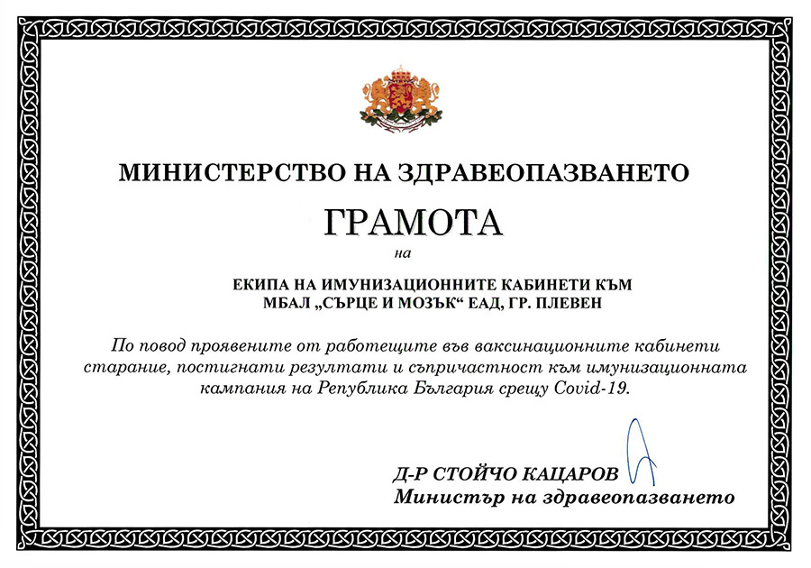 Грамота от Министерството на здравеопазването за най-висок резултат при ваксиниране на населението и за съпричастност към имунизационната кампания срещу COVID-19 в област Плевен бе връчена на административния директор на болница Сърце и Мозък Мартин Митев от областния управител Марио Тодоров в присъствието на директора на Регионалната здравна инспекция д-р Илиян Минчев. Церемонията се състоя в зала Плевен на Областната администрация.