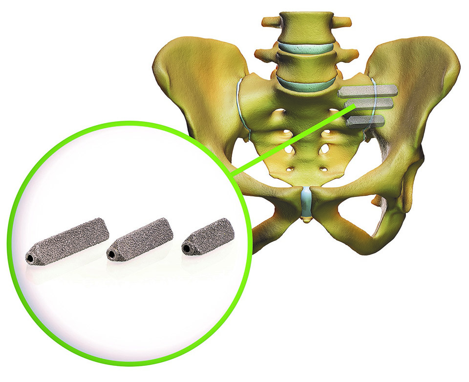 Анатомическая локализация крестцово-подвздошного сустава и размещение титановых 3D-имплантов для стабилизирования сустава.